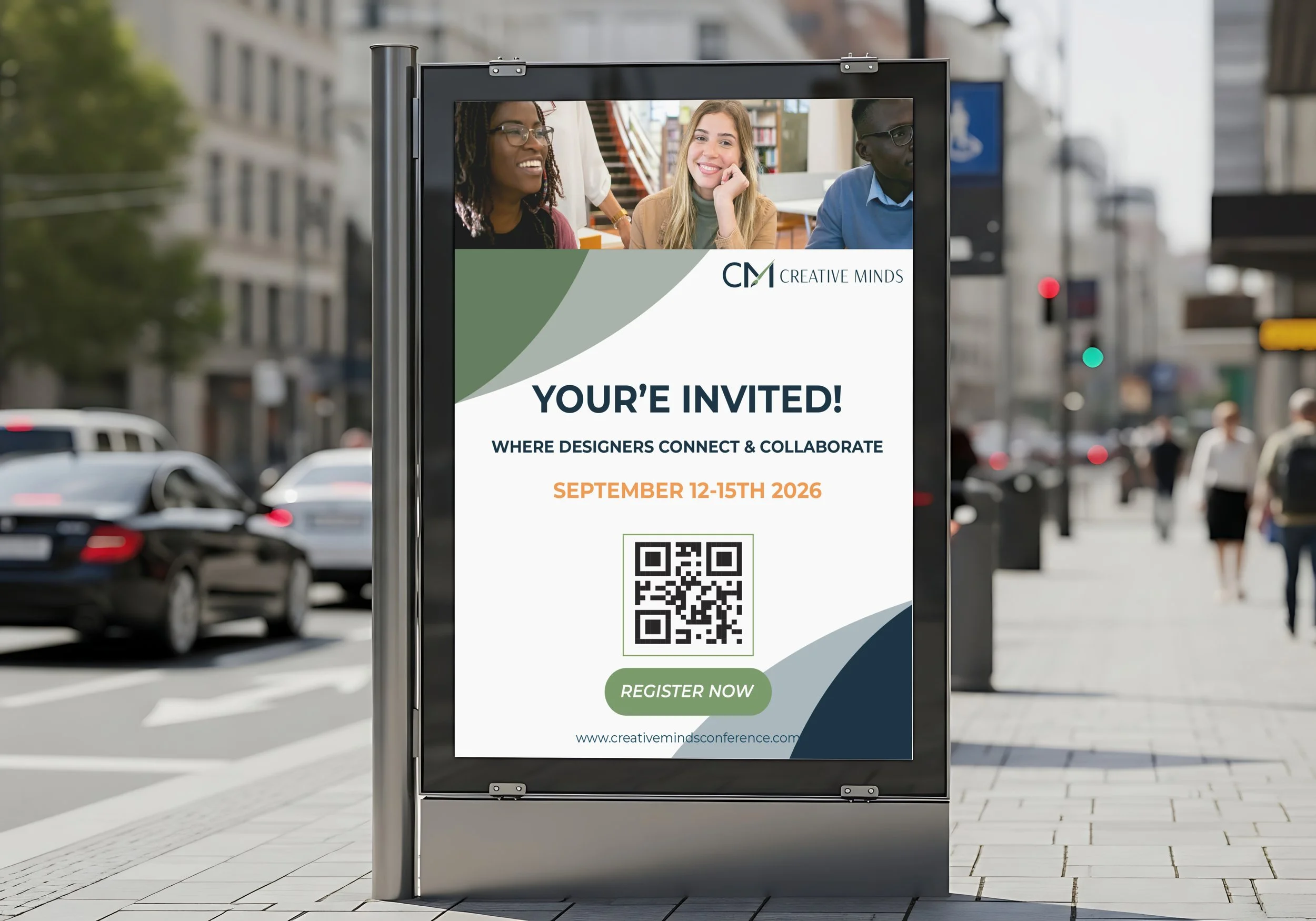 Creative Minds is a design-focused conference aimed at connecting emerging and professional creatives through collaboration and shared learning. This project involved creating a cohesive visual identity and promotional system that communicates inspiration, accessibility, and professionalism across digital and print platforms. The final brand supports audience engagement, strengthens recognition, and promotes the conference as a welcoming space for creative growth.