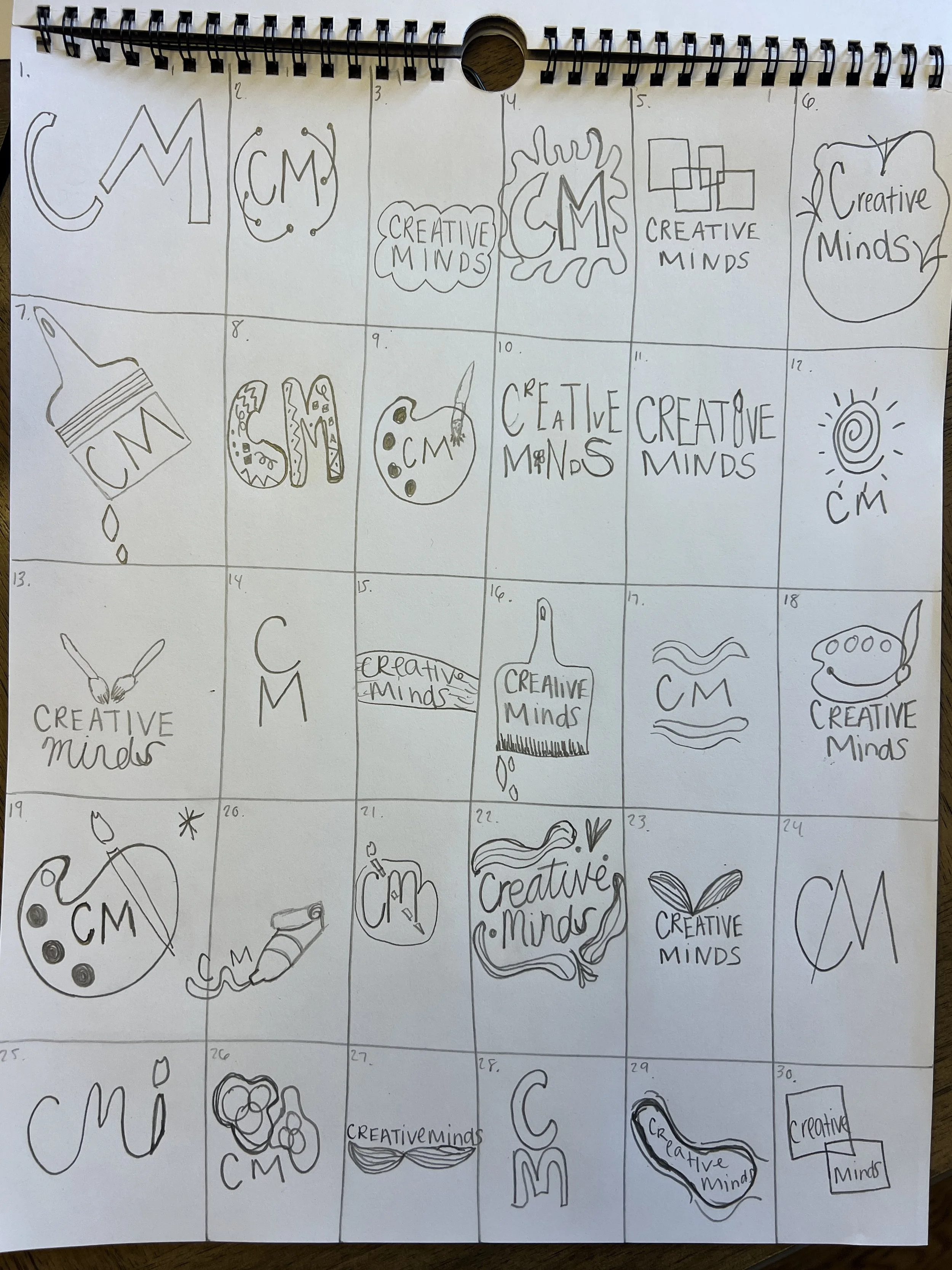 Early concepts were explored through quick hand-drawn thumbnails to experiment with different directions, compositions, and visual ideas. This stage focused on generating a wide range of possibilities without overthinking, allowing me to explore symbolism and how the “CM” could be represented in a creative and meaningful way. Through this process, the paintbrush concept emerged as the strongest solution, representing creativity, connection, and growth.