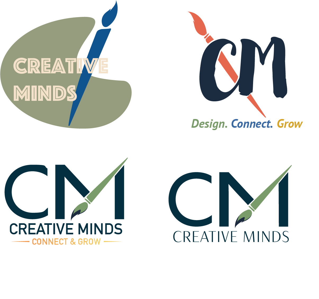Early logo concepts were explored through hand sketches to test symbolism, composition, and visual tone. This process helped identify the paintbrush as the strongest representation of creativity, connection, and growth, leading to the refined final logo.