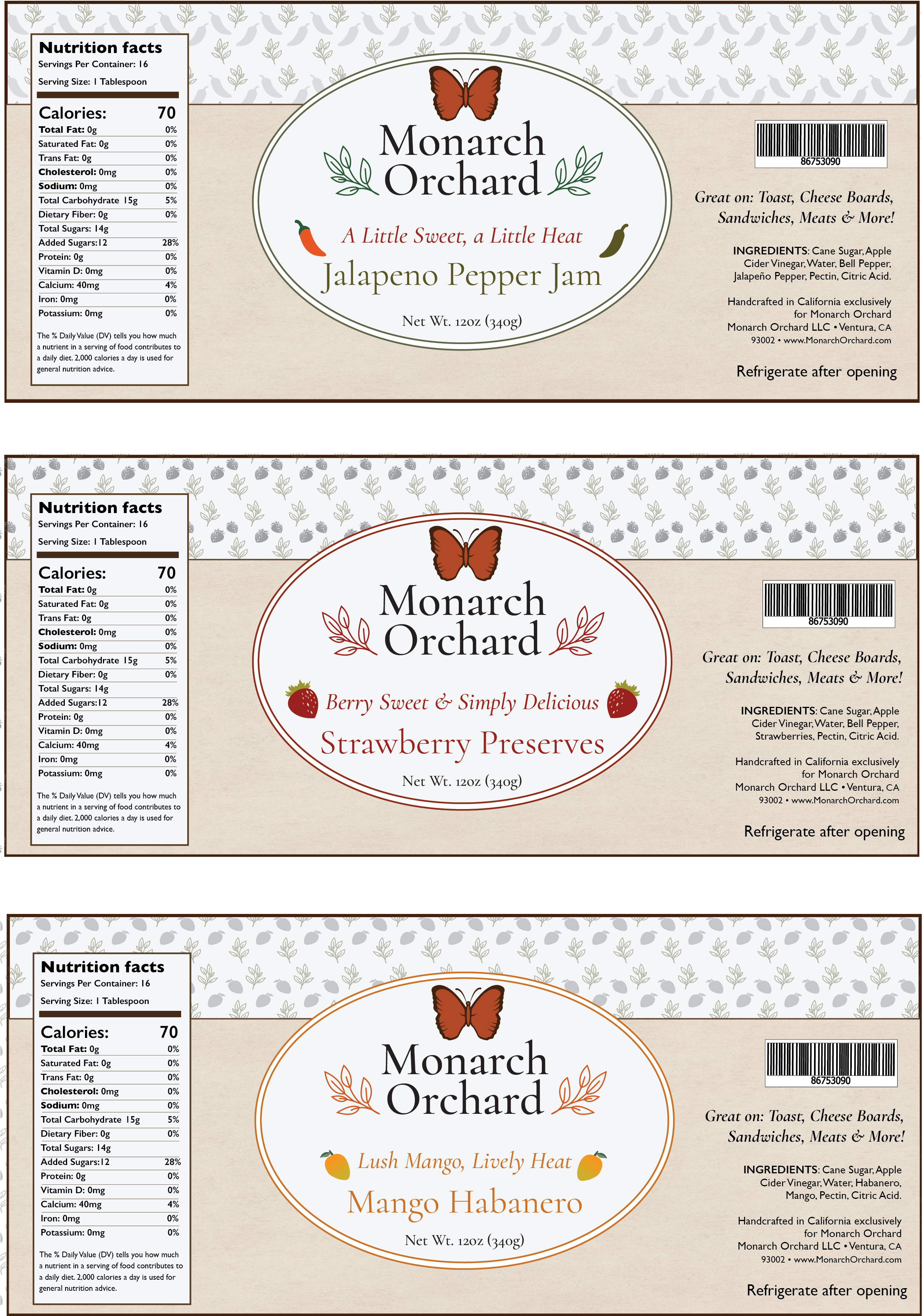 Monarch Orchard is a small-batch artisanal jam brand inspired by heirloom recipes and seasonal ingredients. The identity was designed to feel handcrafted, elevated, and shelf-ready while maintaining warmth and approachability.