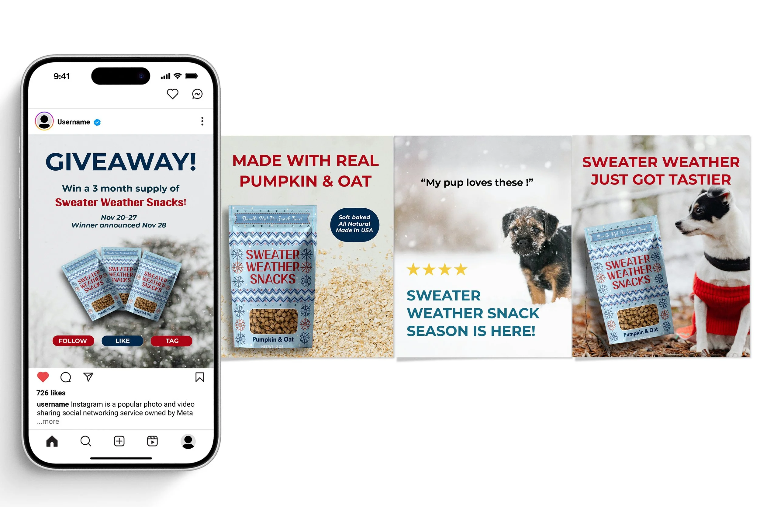 The campaign focuses on creating an emotional connection with pet owners by tapping into the familiar comfort of “sweater weather.” Visual elements such as knit-inspired patterns, snowflake illustrations, and soft winter color palettes reinforce the seasonal theme. The messaging emphasizes warmth, comfort, and seasonal excitement, positioning the treats as a fun reward for pets during colder months.