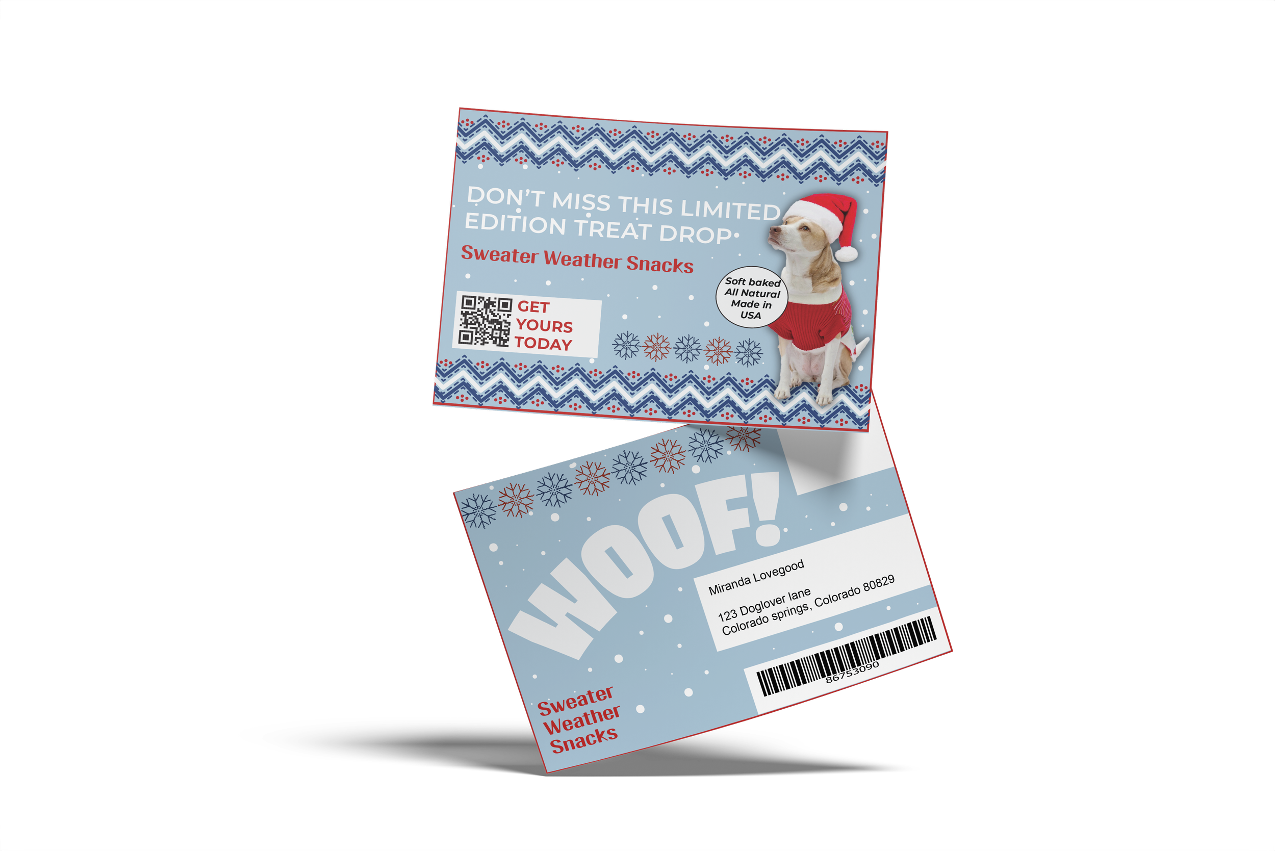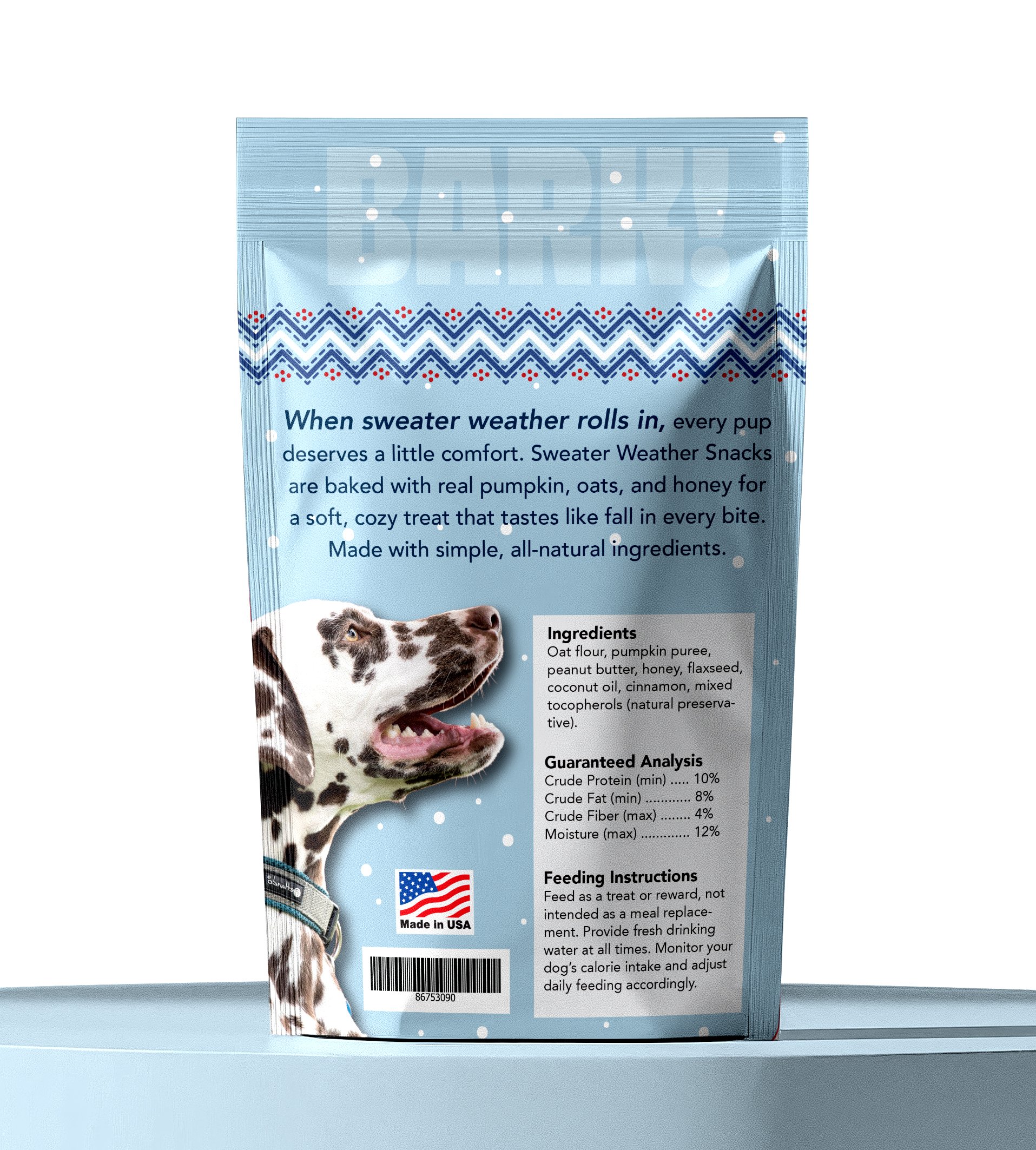 This project explores a seasonal packaging and marketing campaign for a winter-themed dog treat product called Sweater Weather Snacks. The concept centers around the cozy feeling of colder months when pets and their owners spend more time indoors together. The goal was to create a playful and visually engaging campaign that captures the warmth and excitement of the holiday season while clearly communicating the product’s natural ingredients and limited-edition appeal.